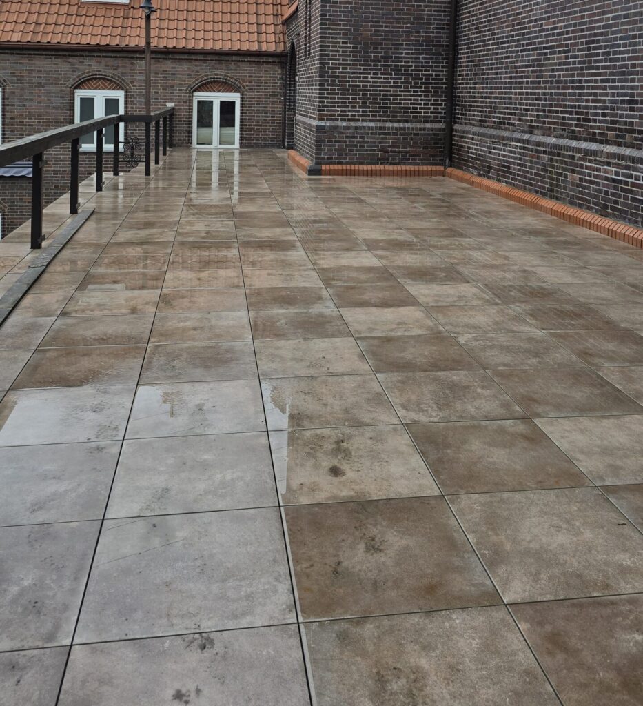 Obecnie trwają prace związane z układaniem warstwy wykończeniowej podłogi. To etap, który bezpośrednio poprzedza finalne zagospodarowanie tarasu i przybliża nas do momentu, w którym odzyska on pełnię swoich walorów użytkowych i estetycznych.